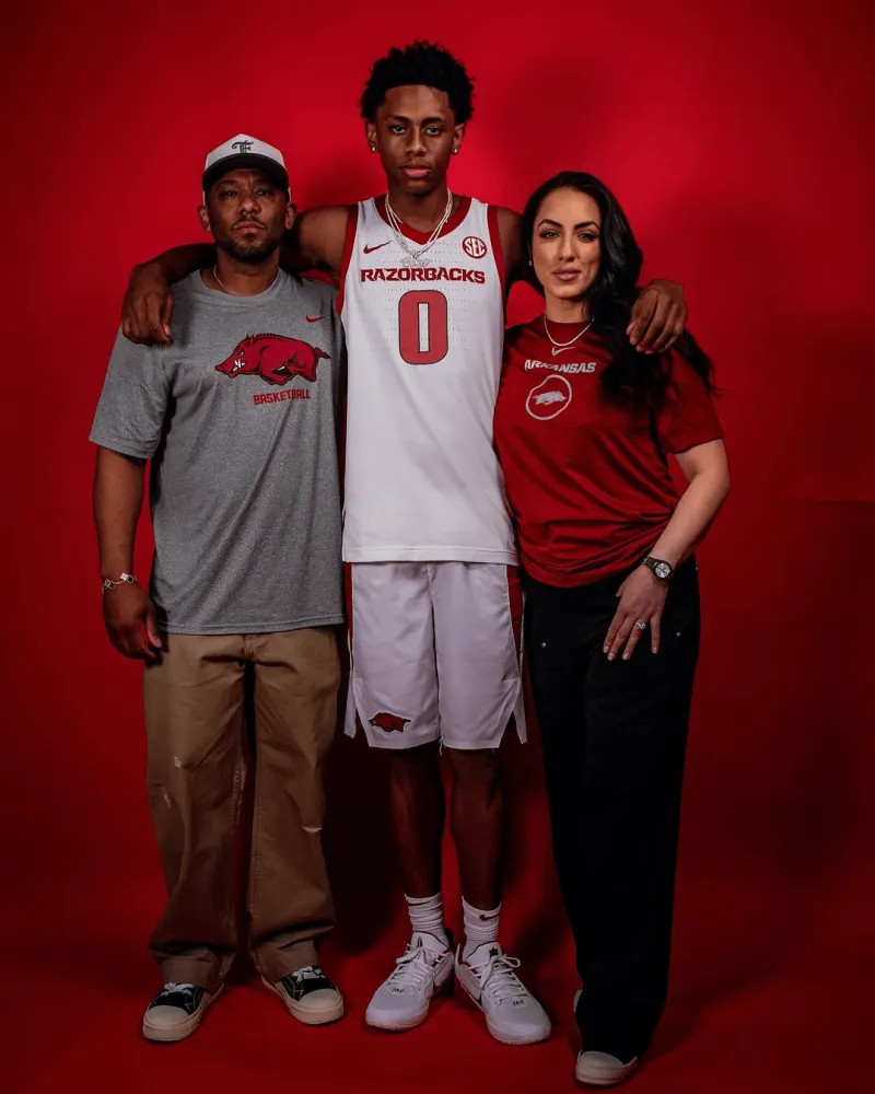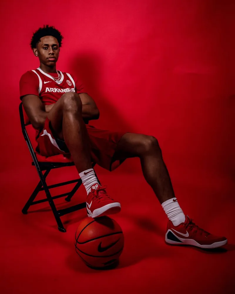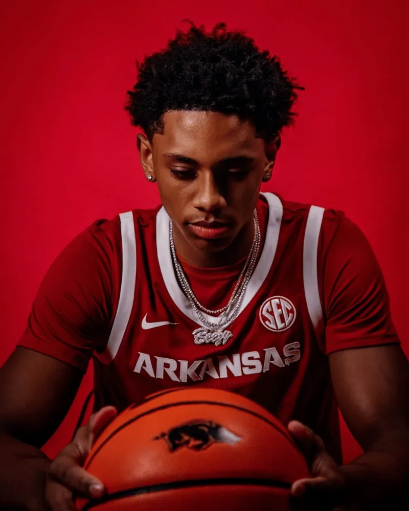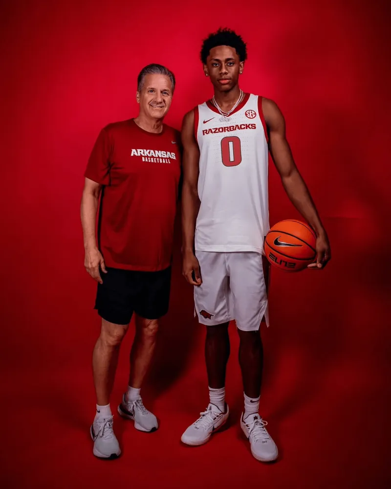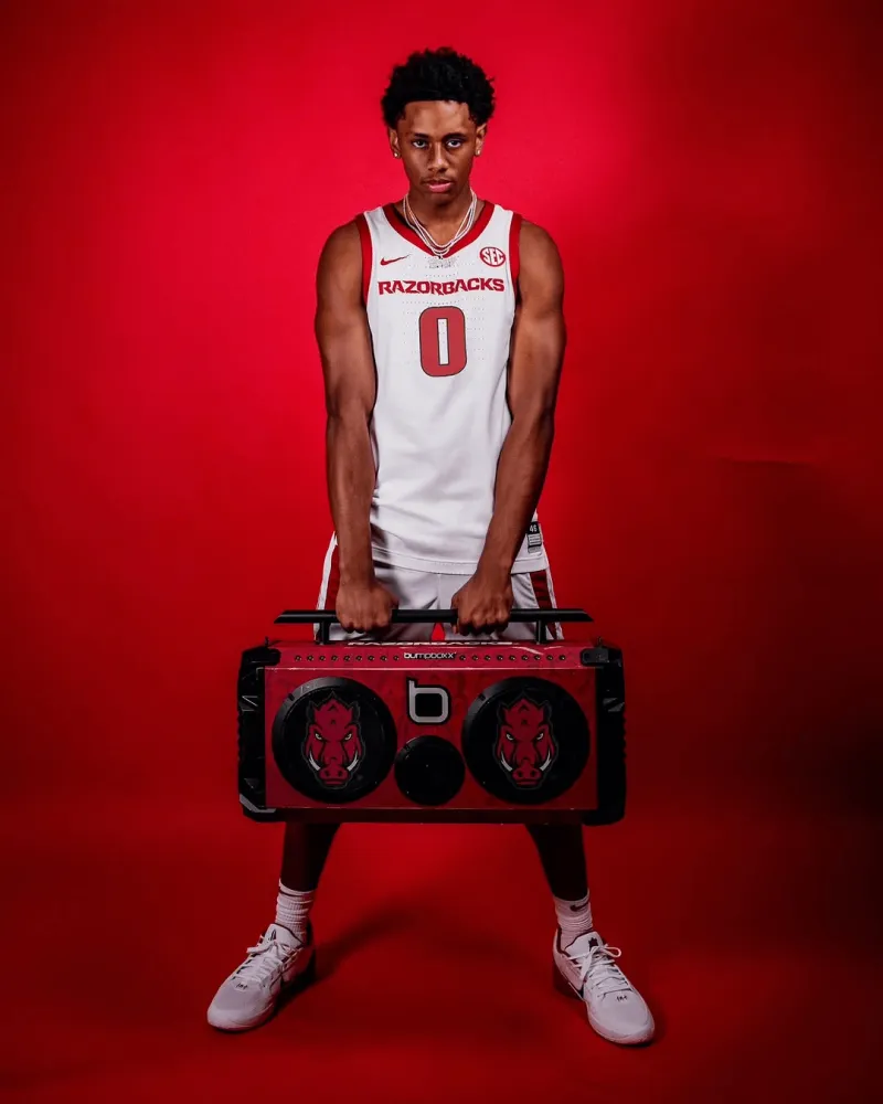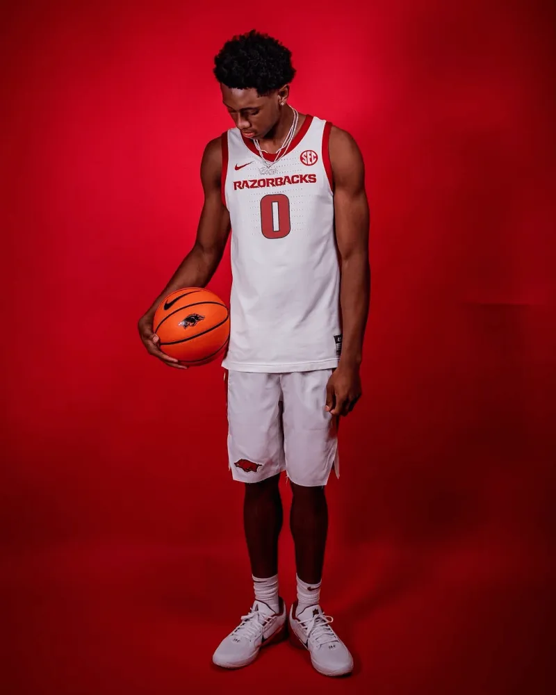 虎扑09月09日讯 2026届“247Sports”全美第一控球后卫布兰登-麦考伊今日访问阿肯色大学野猪队(Arkansas Razorbacks),并为其拍摄定妆照。