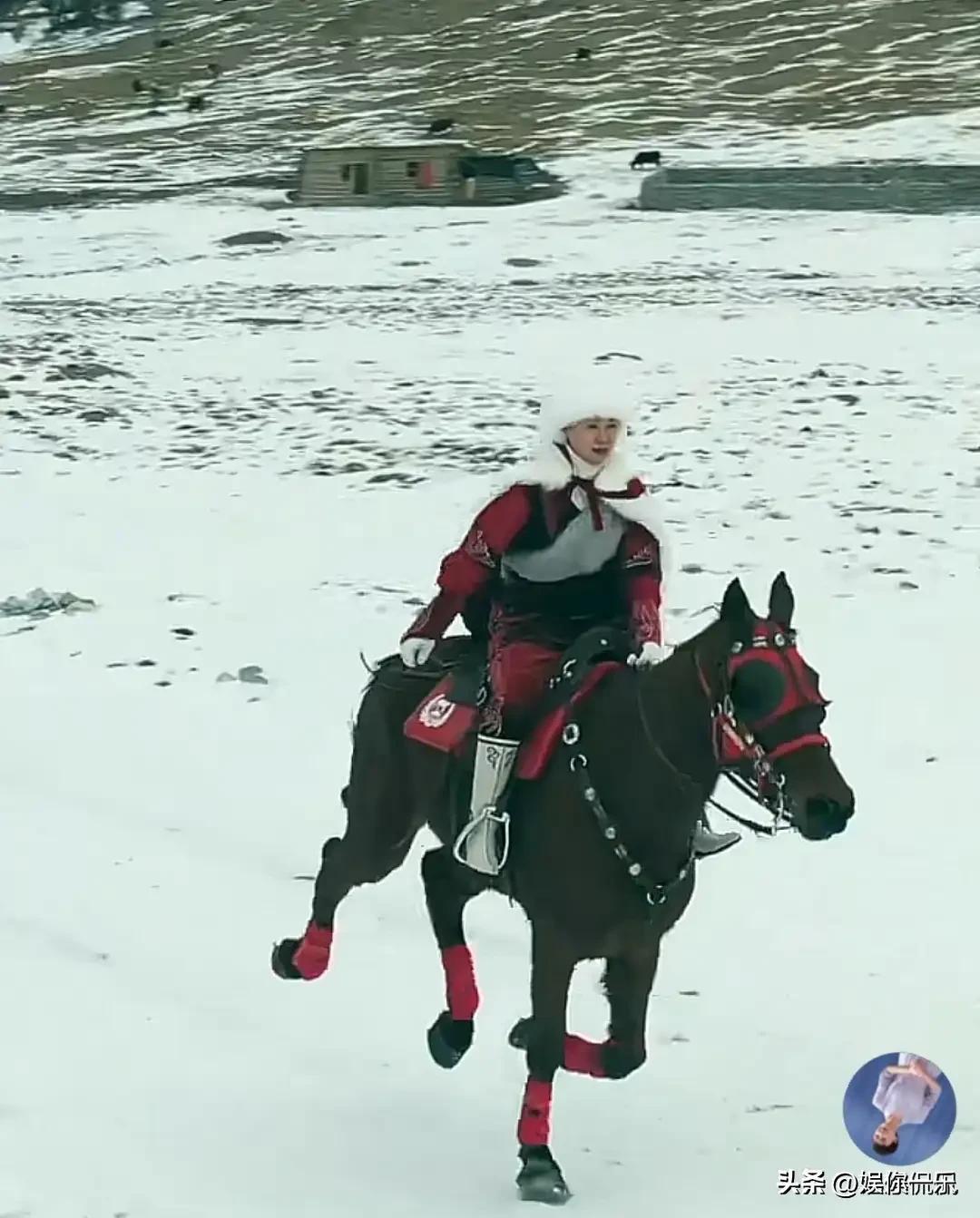 系着围裙站在灶台前做拉条子,笑着说“新疆人谁不会做拉条子”时,又带着烟火气的亲切;而雪地里骑枣红马驰骋的她,红黑配色的骑装衬得她英姿飒爽,眉眼间的韧劲让人心生敬佩。